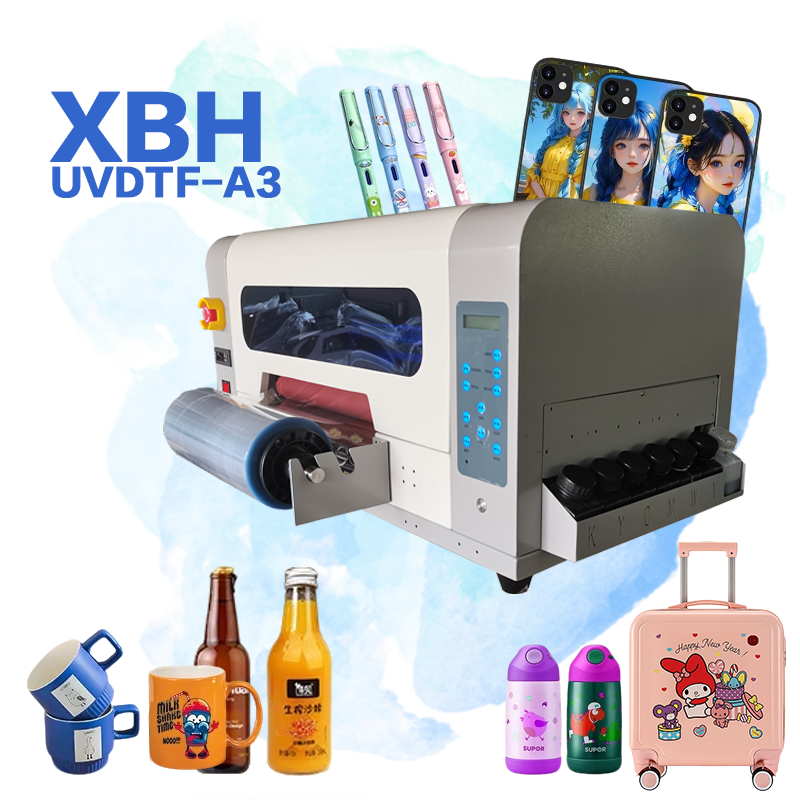 The XBH desktop UV bottle printer features a 360-degree rotating drum and is suitable for printing on cups, cans, and perfume bottles. -
